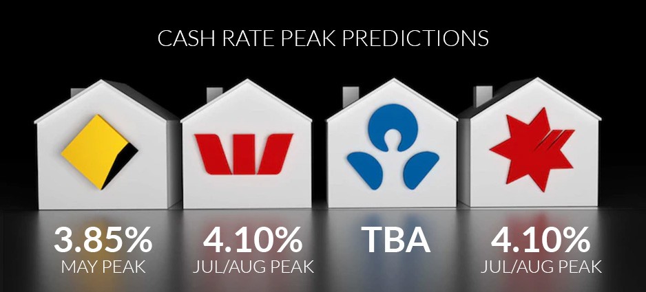 According to the predictions of the big four banks, there is uncertainty about the future direction of interest rates. CBA believes that 3.85% is the cash rate peak, while Westpac and NAB have pencilled in another potential rate hike in either July or August 2023, bringing it to a peak of 4.10%. ANZ has yet to make a firm current prediction.